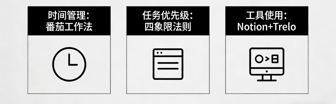 职场人优先掌握核心组合:番茄法+批量处理+复盘闭环,搞定执行效率、减少切换损耗;搭配四象限法则、每日3重点,快速筛选高价值任务,拒绝瞎忙,高效落地。